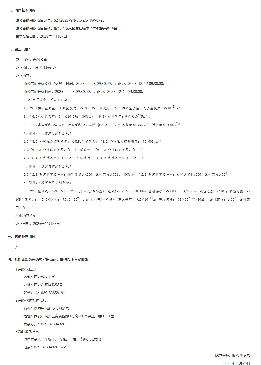 西安科技大学镓离子双束聚焦扫描电子显微镜采购项目采购更正公告(第一次)