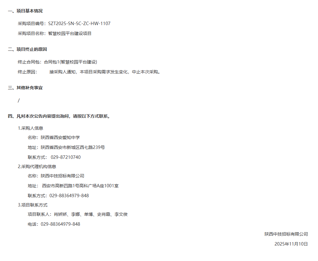 陕西省西安爱知中学智慧校园平台建设项目中止公告