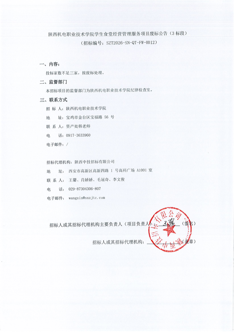 陕西机电职业技术学院学生食堂经营管理服务项目废标公告(3标段)
