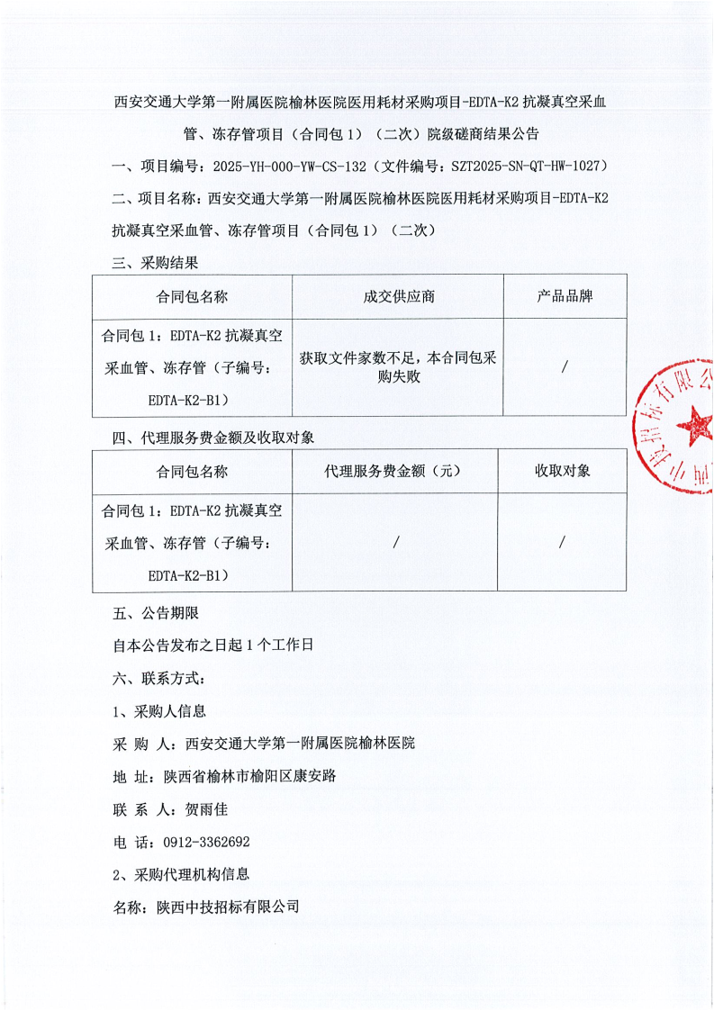 西安交通大学第一附属医院榆林医院医用耗材采购项目-EDTA-K2抗凝真空采血管、冻存管项目(合同包1)(二次)院级磋商结果公告