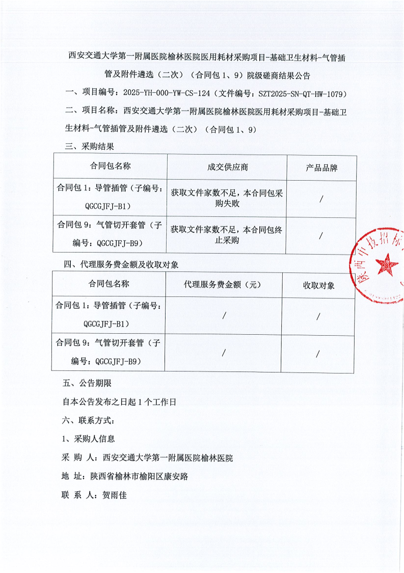 西安交通大学第一附属医院榆林医院医用耗材采购项目-基础卫生材料-气管插管及附件遴选(二次)(合同包1、9)院级磋商结果公告