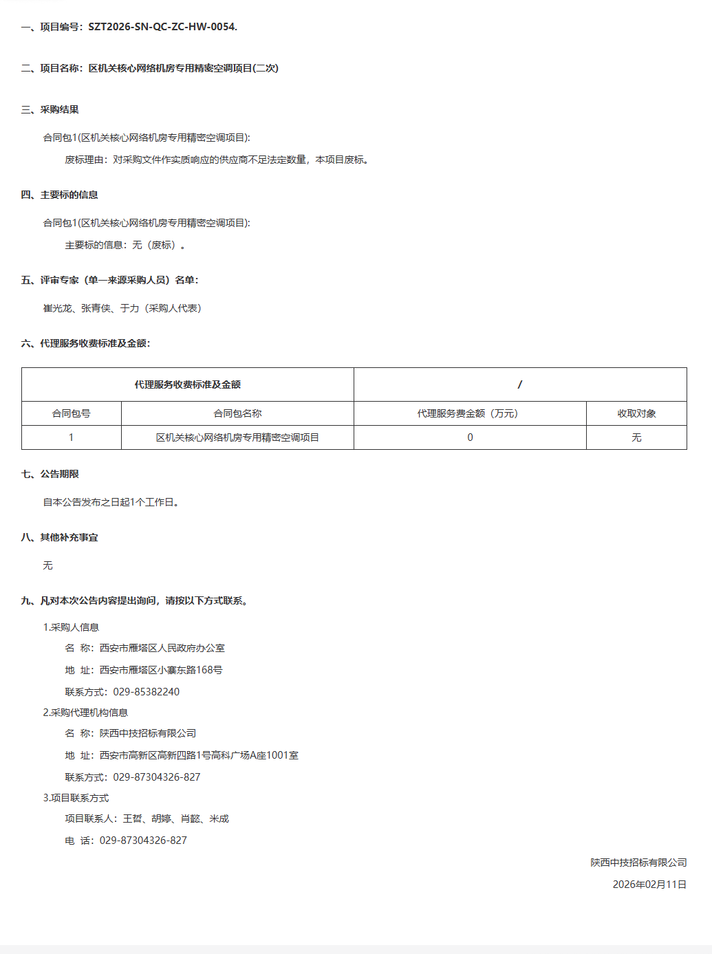 西安市雁塔区人民政府办公室区机关核心网络机房专用精密空调项目(二次)结果公告