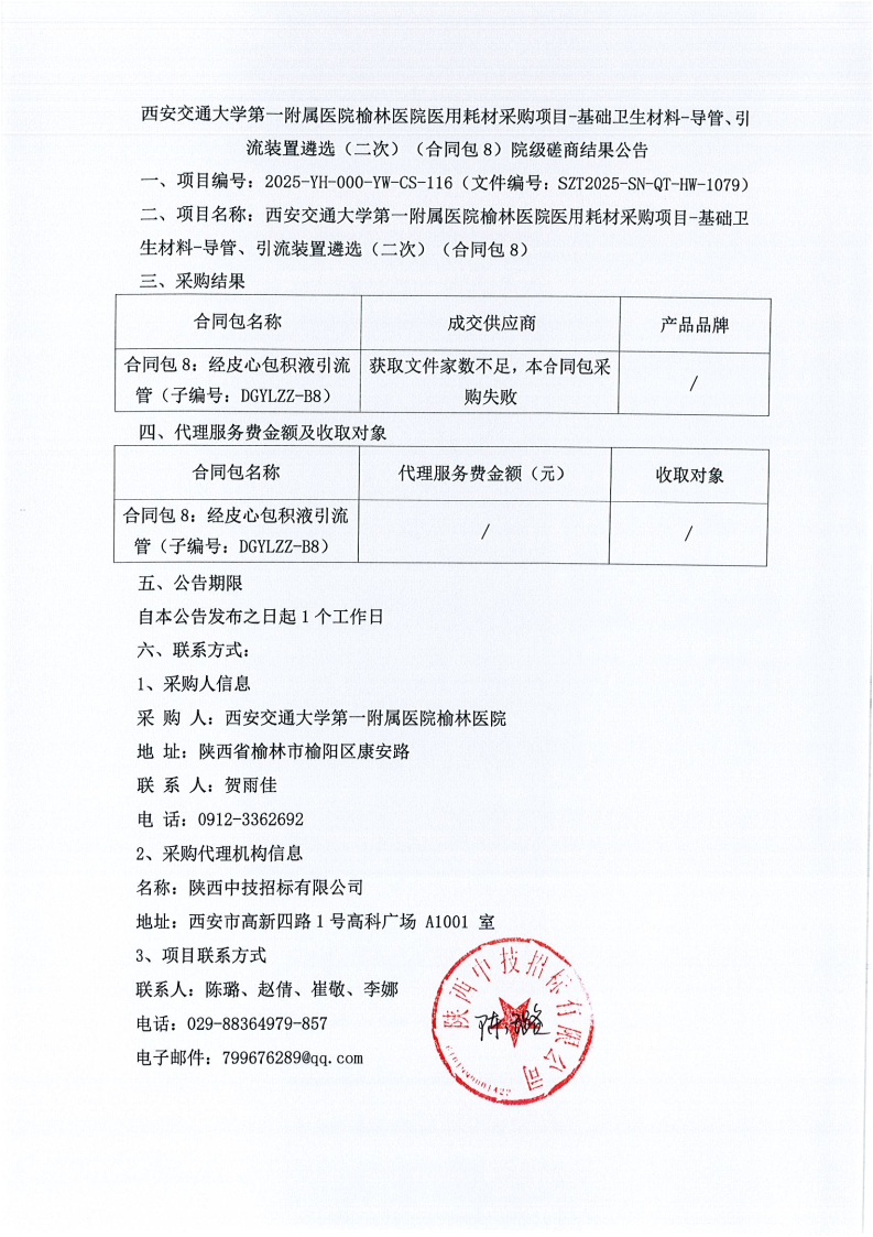 西安交通大学第一附属医院榆林医院医用耗材采购项目-基础卫生材料-导管、引流装置遴选(二次)(合同包8)院级磋商结果公告