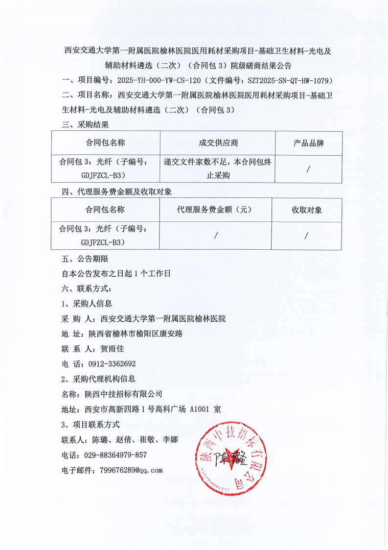西安交通大学第一附属医院榆林医院医用耗材采购项目-基础卫生材料-光电及辅助材料遴选(二次)(合同包3)院级磋商结果公告