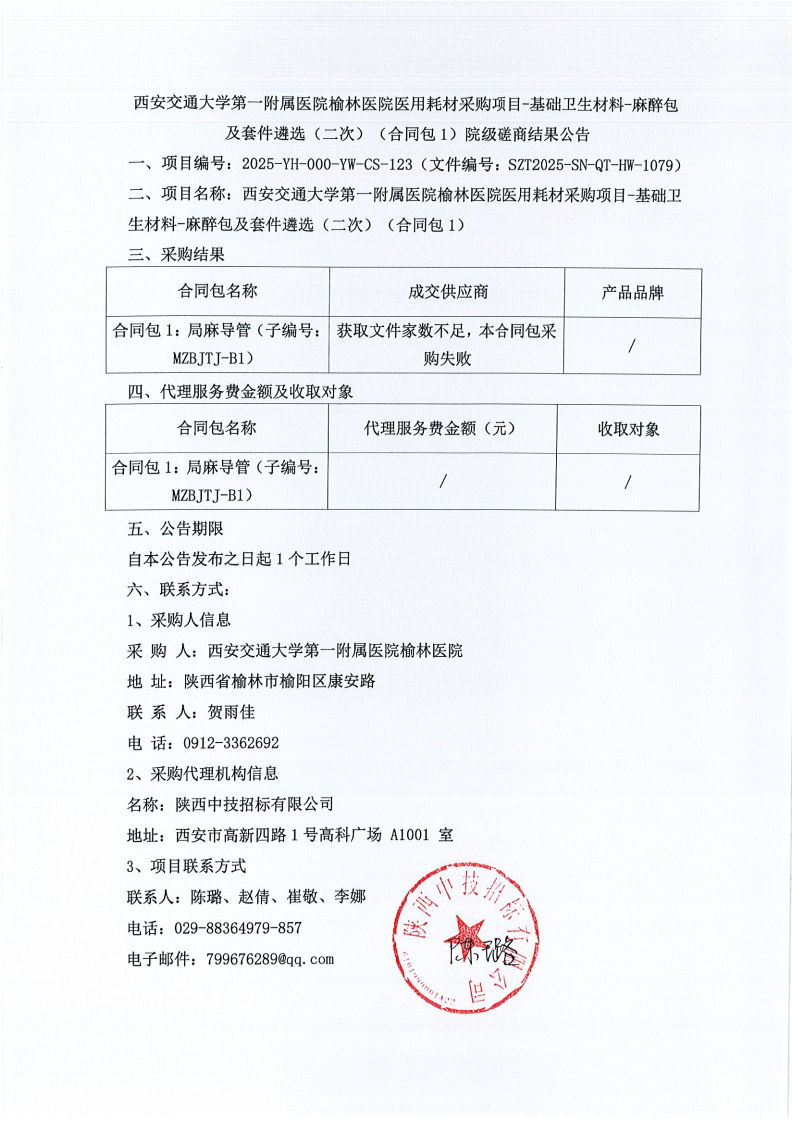 西安交通大学第一附属医院榆林医院医用耗材采购项目-基础卫生材料-麻醉包及套件遴选(二次)(合同包1)院级磋商结果公告