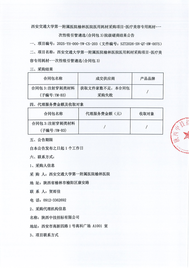 西安交通大学第一附属医院榆林医院医用耗材采购项目-医疗美容专用耗材-一次性吸引管遴选(合同包3)院级磋商结果公告