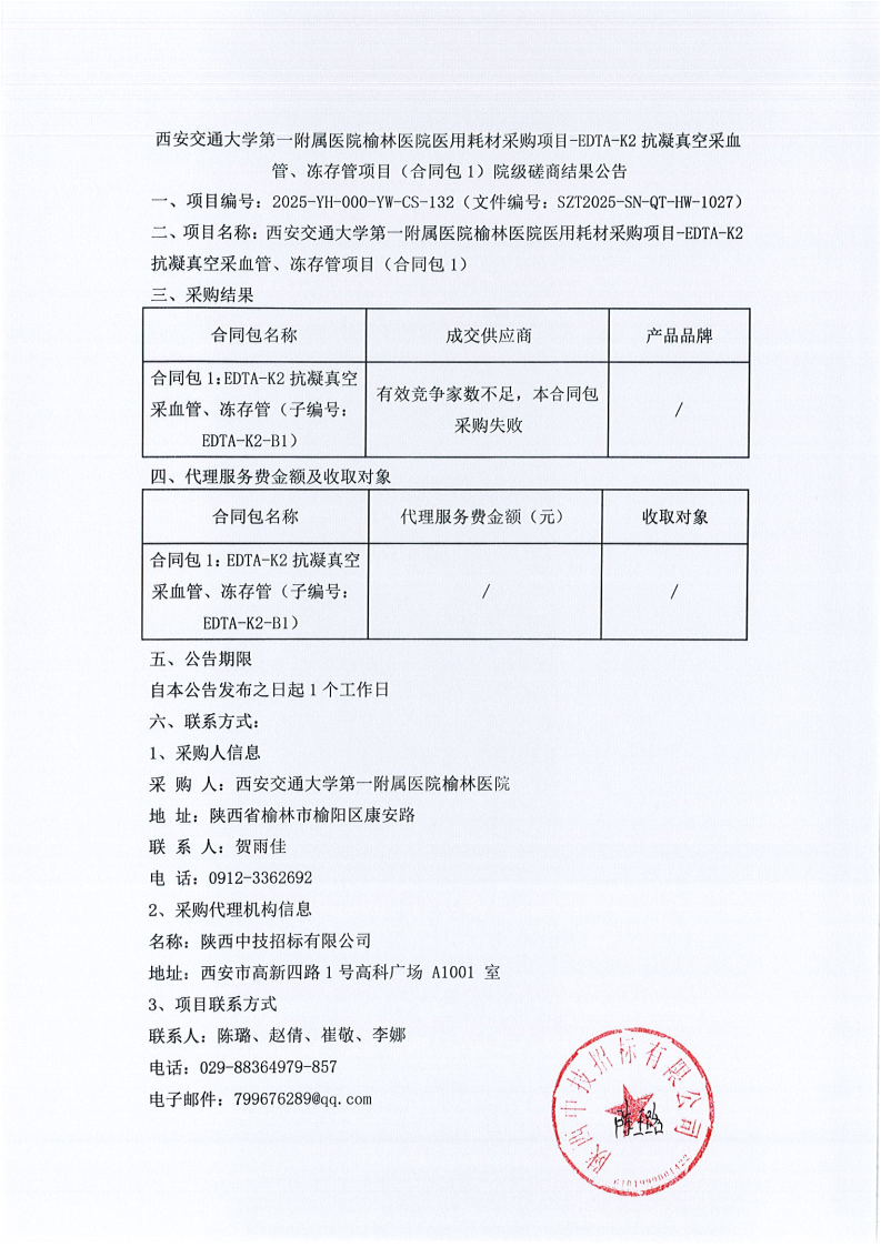 西安交通大学第一附属医院榆林医院医用耗材采购项目-EDTA-K2抗凝真空采血管、冻存管项目(合同包1)院级磋商结果公告