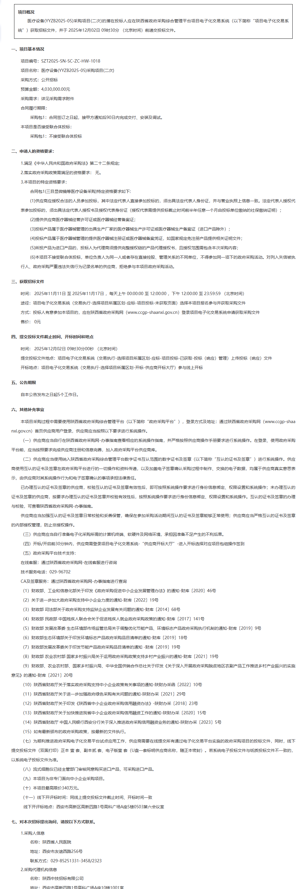 陕西省人民医院医疗设备(YYZB2025-05)采购项目(二次)招标公告