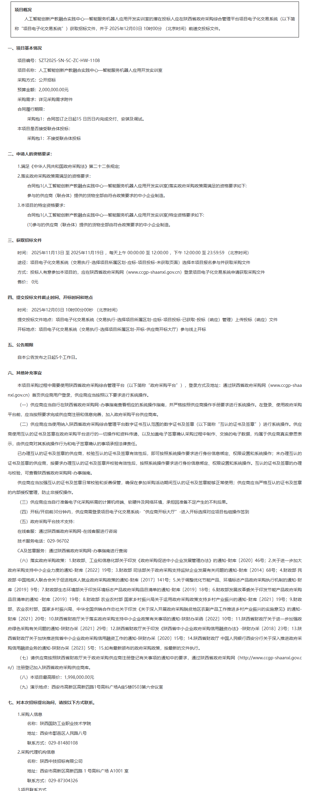 陕西国防工业职业技术学院人工智能创新产教融合实践中心—智能服务机器人应用开发实训室招标公告