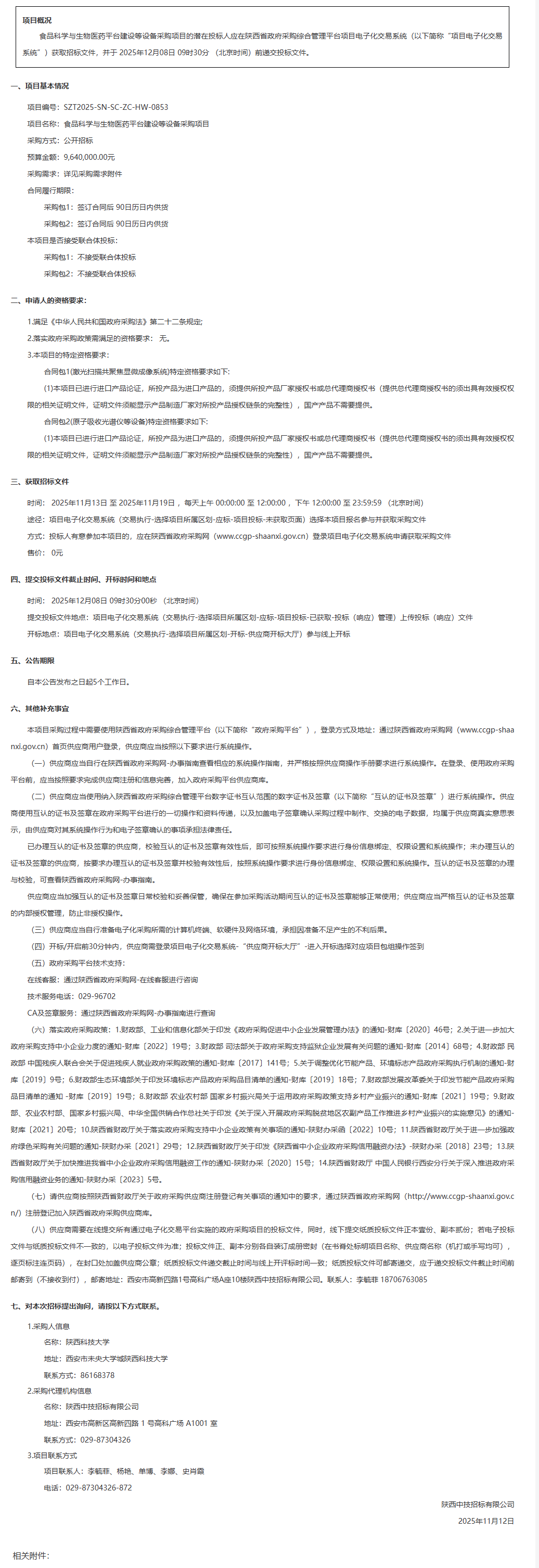 陕西科技大学食品科学与生物医药平台建设等设备采购项目招标公告