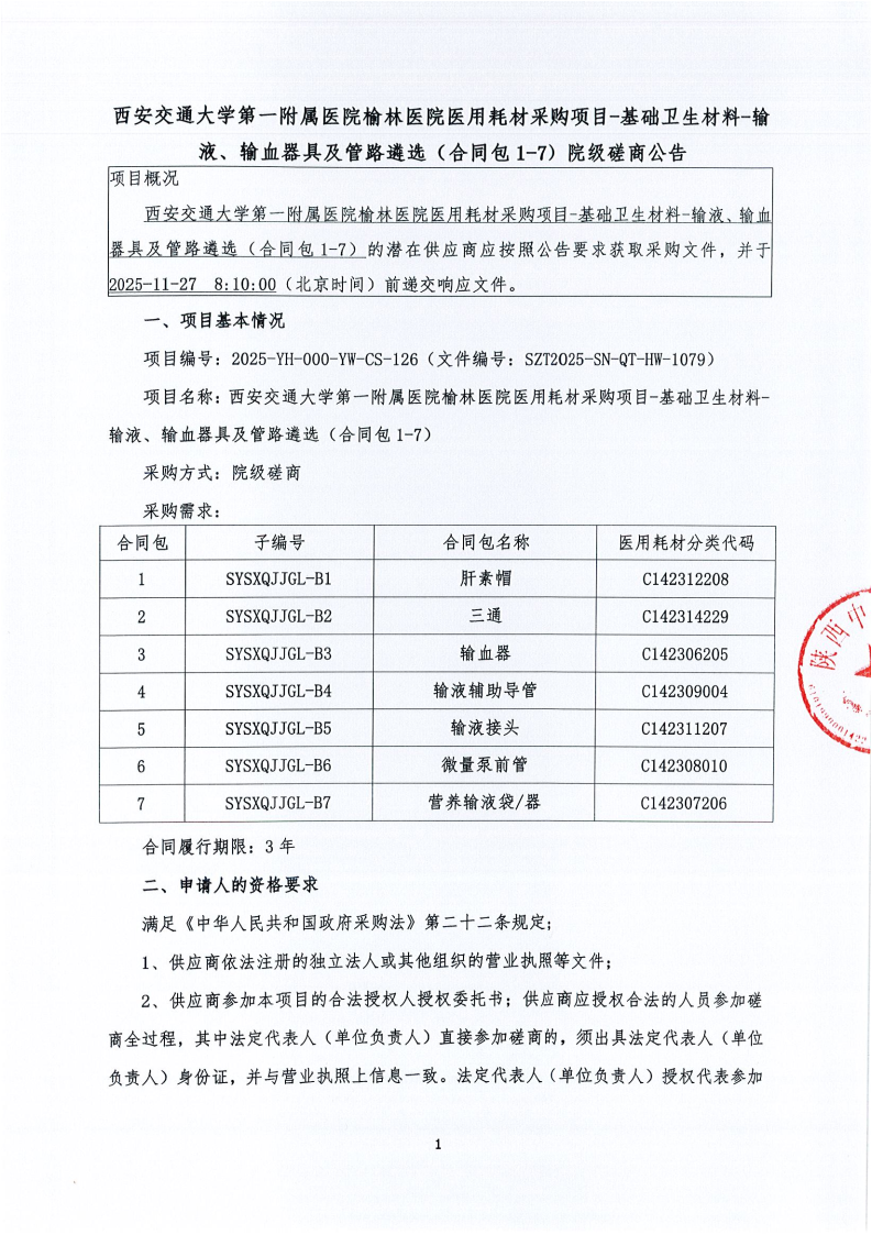 西安交通大学第一附属医院榆林医院医用耗材采购项目-基础卫生材料-输液、输血器具及管路遴选(合同包1-7)院级磋商公告
