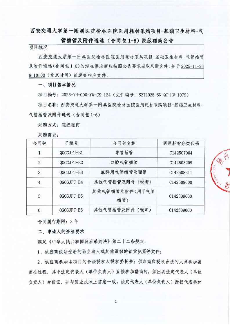 西安交通大学第一附属医院榆林医院医用耗材采购项目-基础卫生材料-气管插管及附件遴选(合同包1-6)院级磋商公告