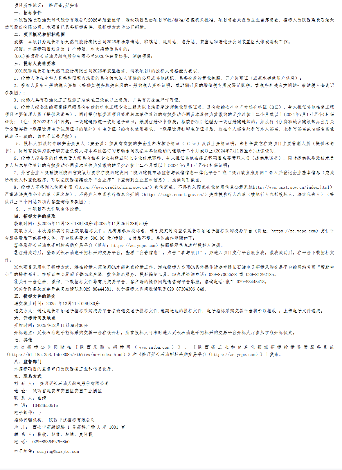 陕西延长石油天然气股份有限公司2026年装置检修、消缺项目公开招标公告