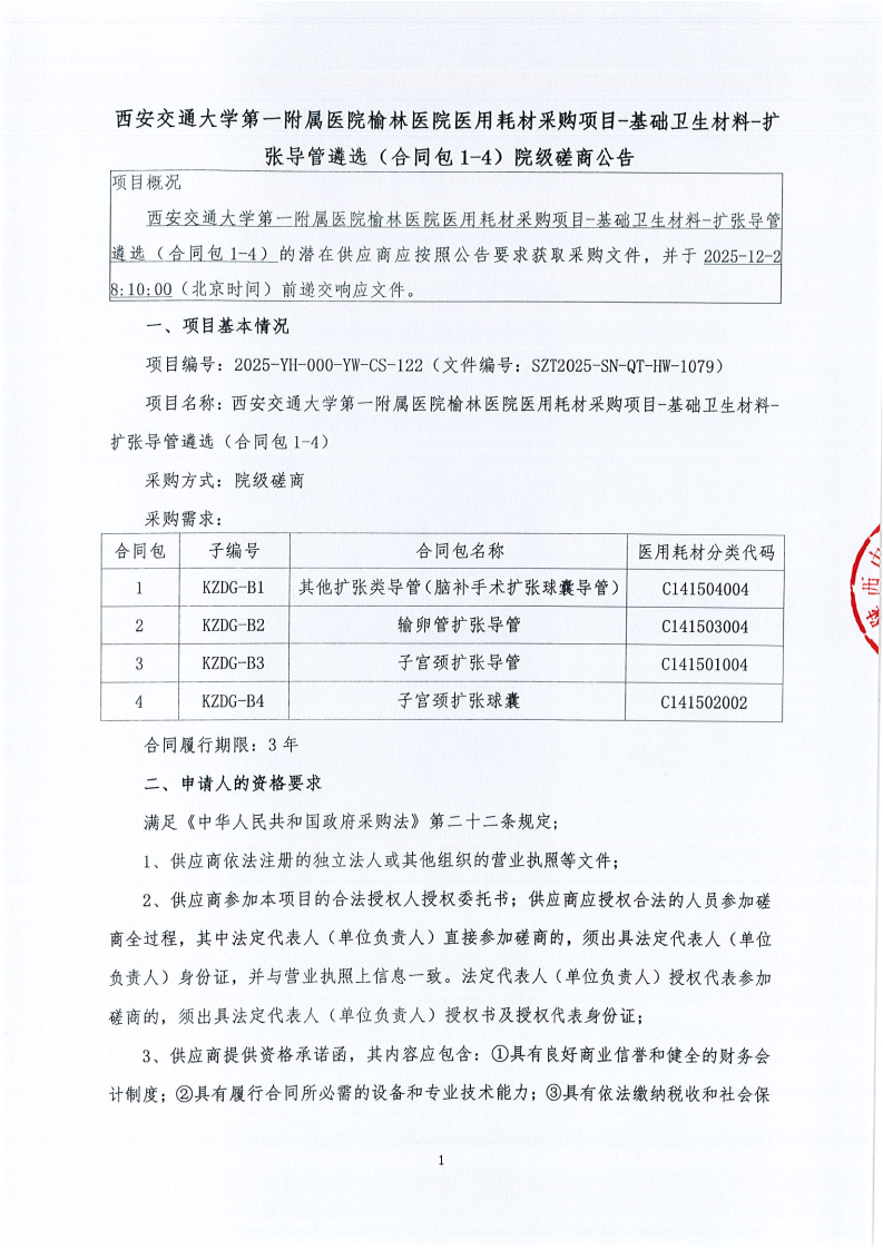 西安交通大学第一附属医院榆林医院医用耗材采购项目-基础卫生材料-扩张导管遴选(合同包1-4)院级磋商公告
