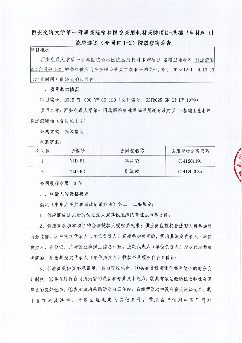 西安交通大学第一附属医院榆林医院医用耗材采购项目-基础卫生材料-引流袋遴选(合同包1-2)院级磋商公告