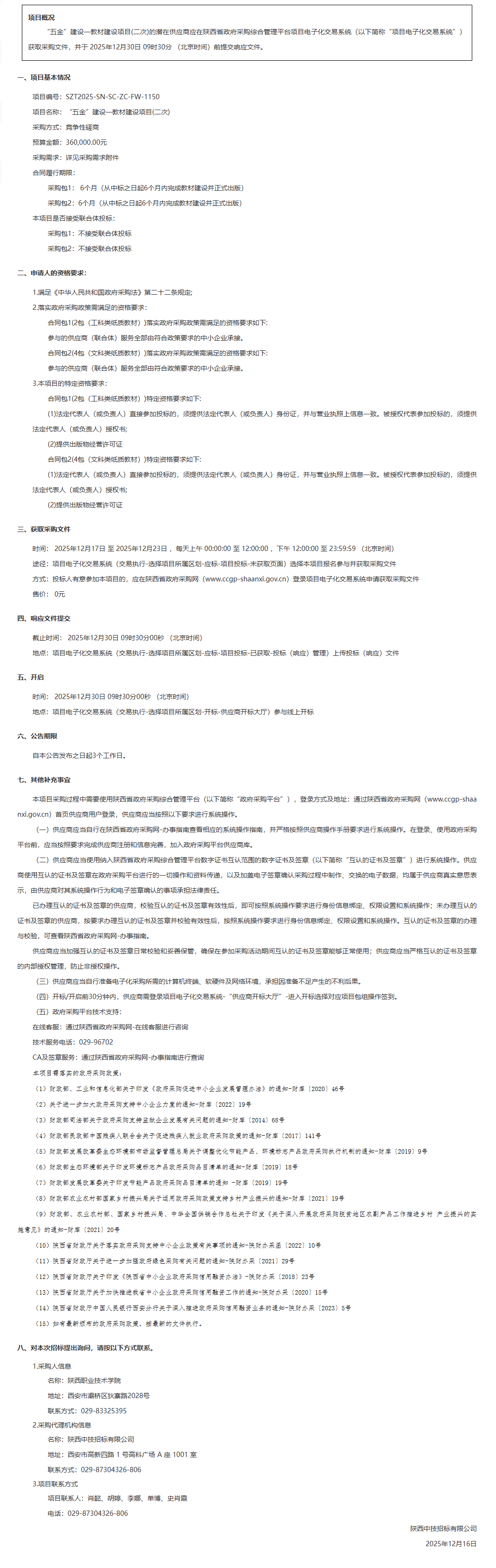 陕西职业技术学院“五金”建设一教材建设项目(二次)竞争性磋商公告