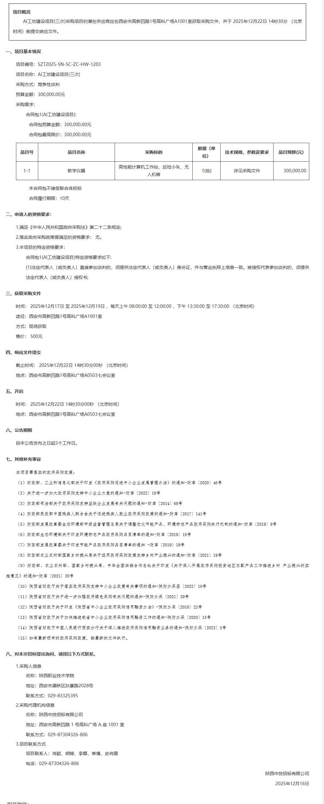 陕西职业技术学院AI工坊建设项目(三次)竞争性谈判公告