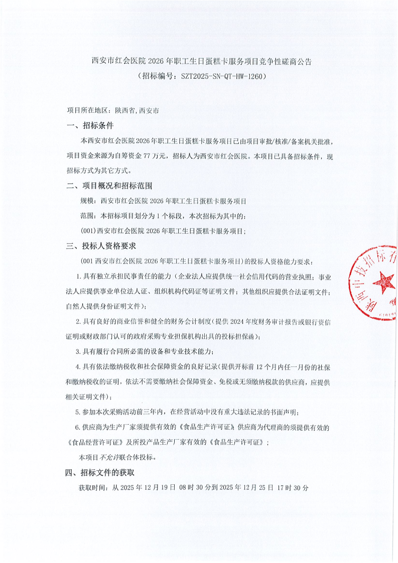 西安市红会医院2026年职工生日蛋糕卡服务项目竞争性磋商公告