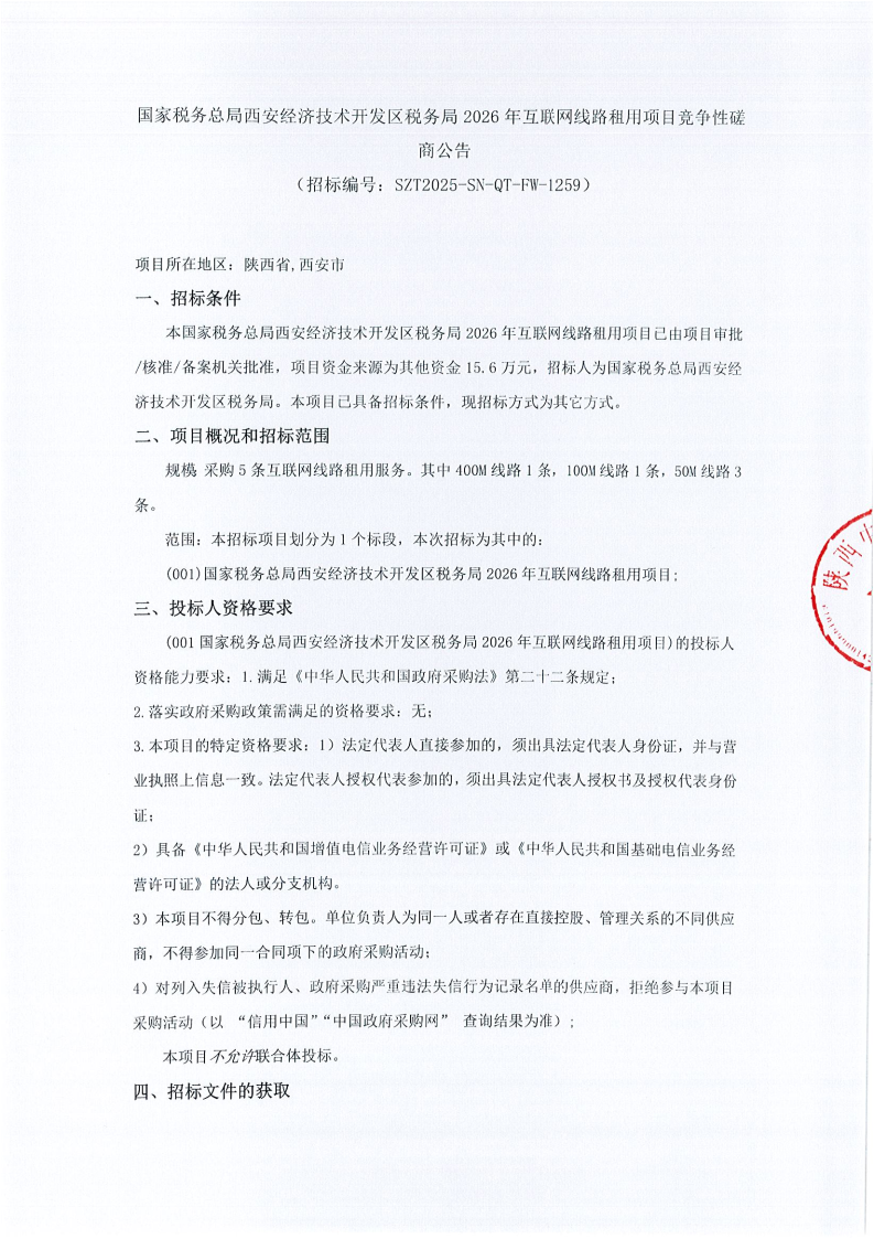 国家税务总局西安经济技术开发区税务局2026年互联网线路租用项目竞争性磋商公告
