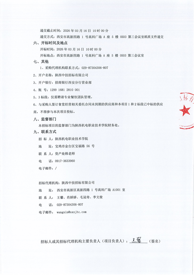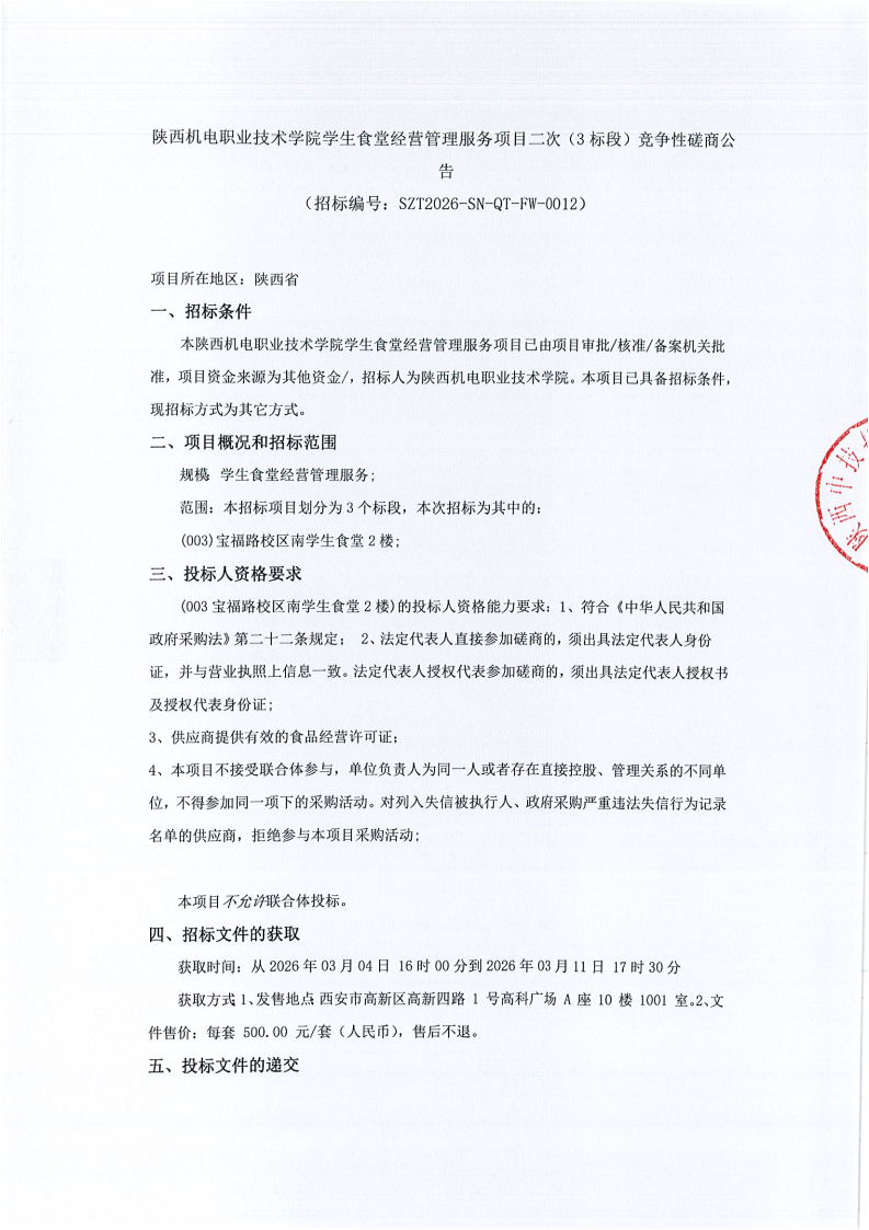 陕西机电职业技术学院学生食堂经营管理服务项目二次(3标段)竞争性磋商公告