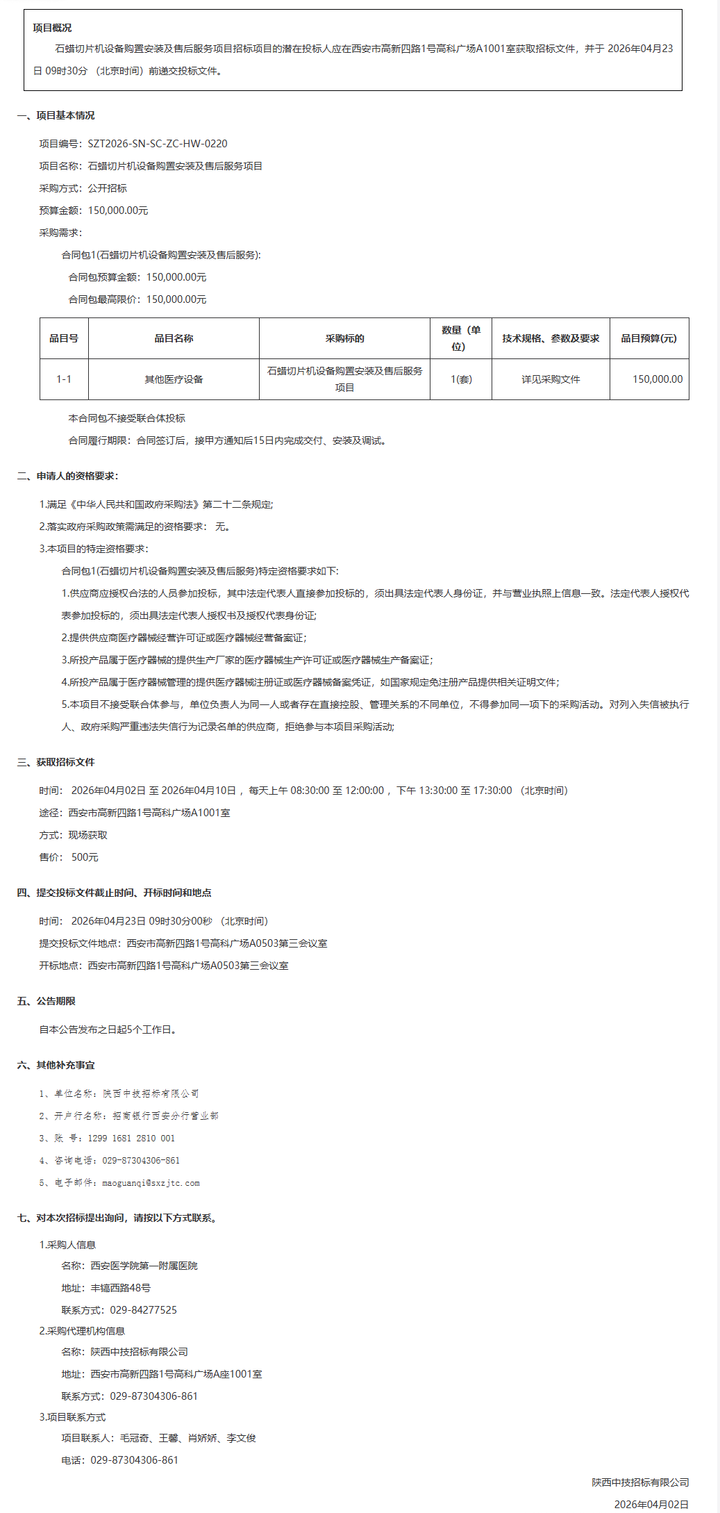 西安医学院第一附属医院石蜡切片机设备购置安装及售后服务项目招标公告