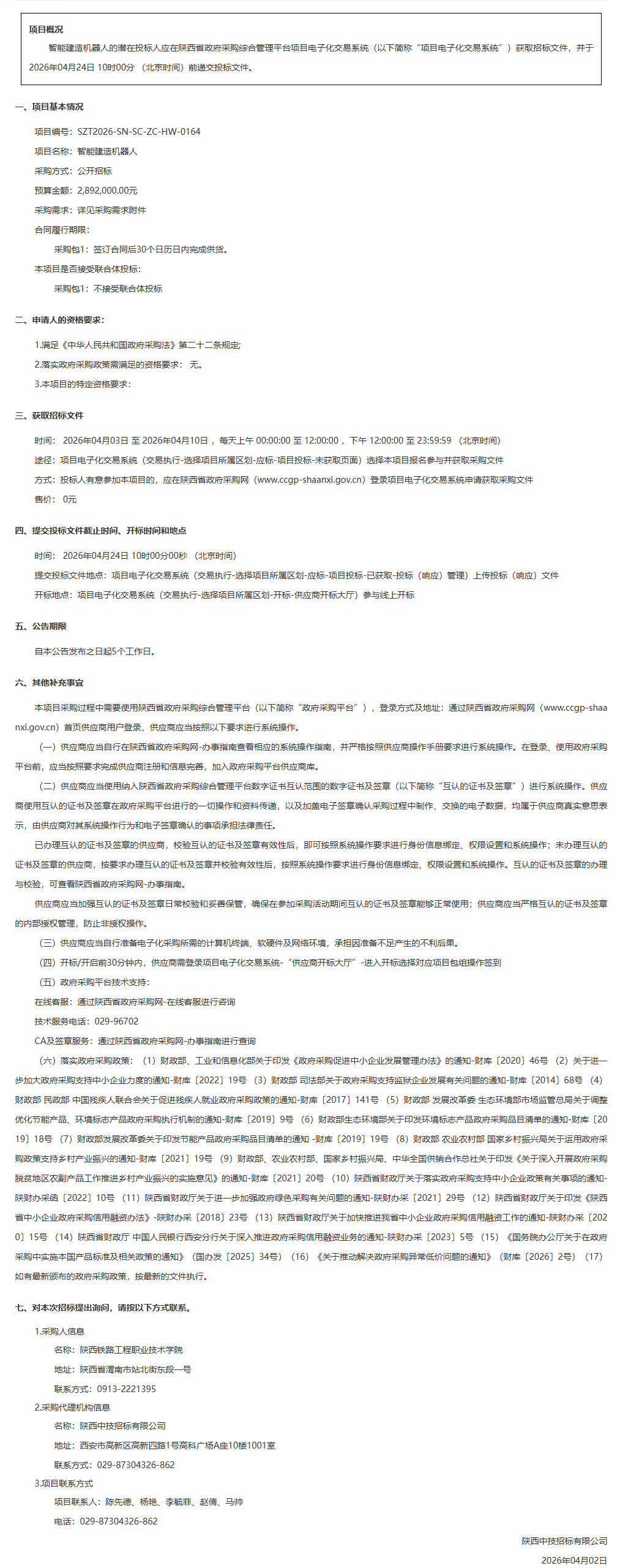 陕西铁路工程职业技术学院智能建造机器人招标公告