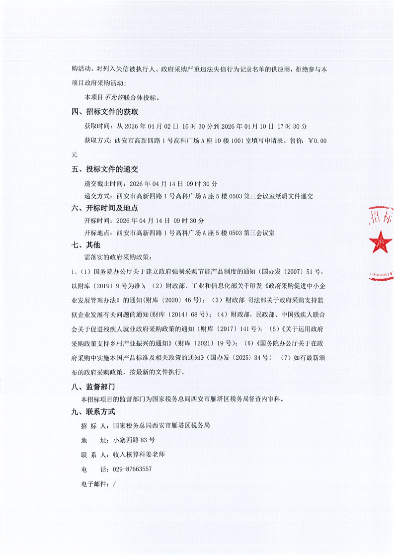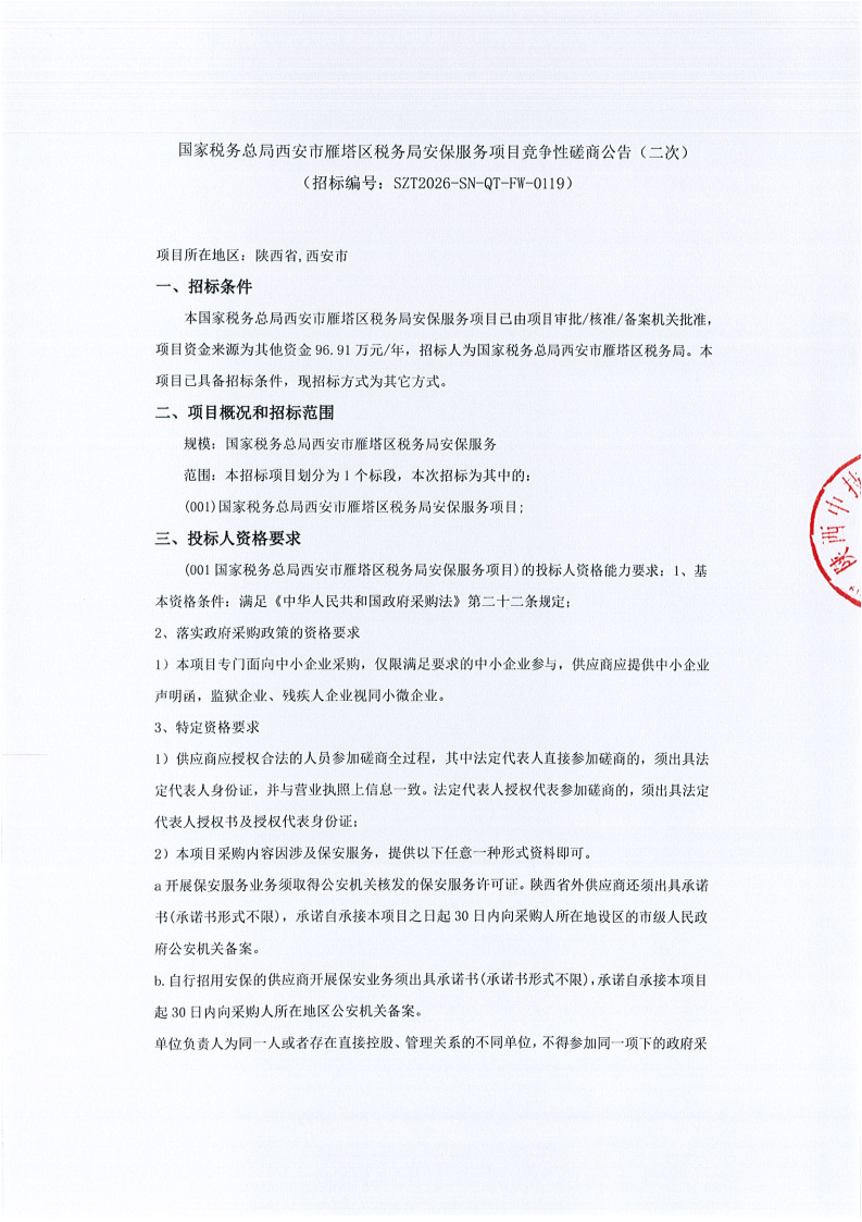国家税务总局西安市雁塔区税务局安保服务项目竞争性磋商公告(二次)