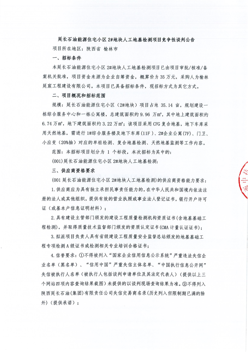 延长石油能源住宅小区2#地块人工地基检测项目竞争性谈判公告