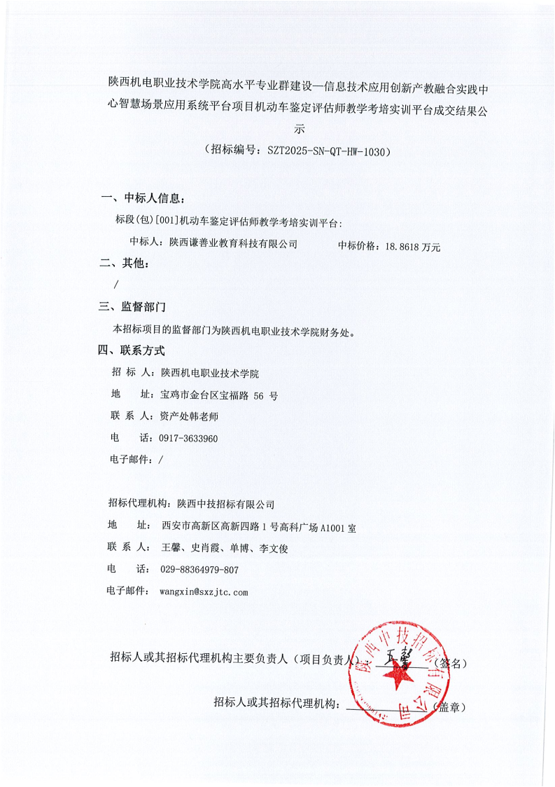 陕西机电职业技术学院高水平专业群建设—信息技术应用创新产教融合实践中心智慧场景应用系统平台项目机动车鉴定评估师教学考培实训平台成交结果公示