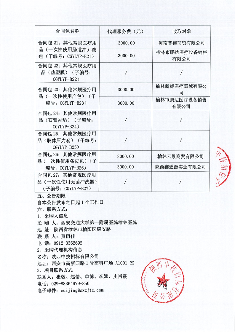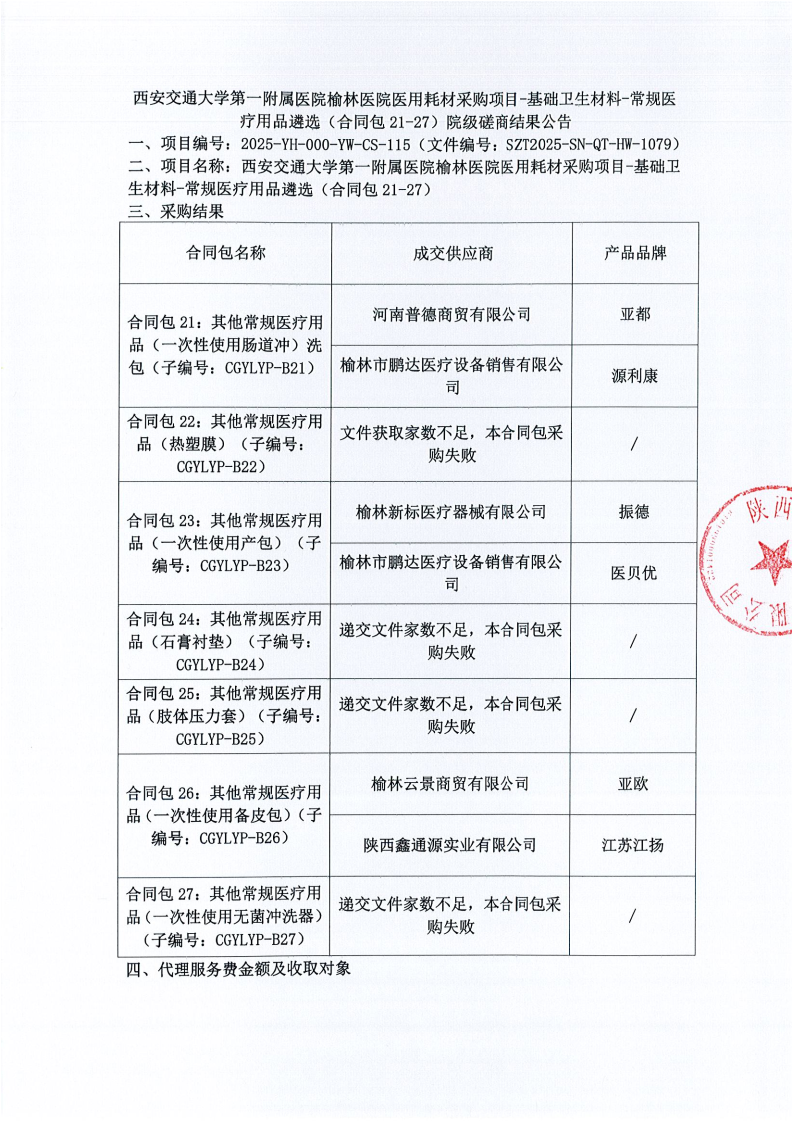 西安交通大学第一附属医院榆林医院医用耗材采购项目-基础卫生材料-常规医疗用品遴选(合同包21-27)院级磋商结果公告