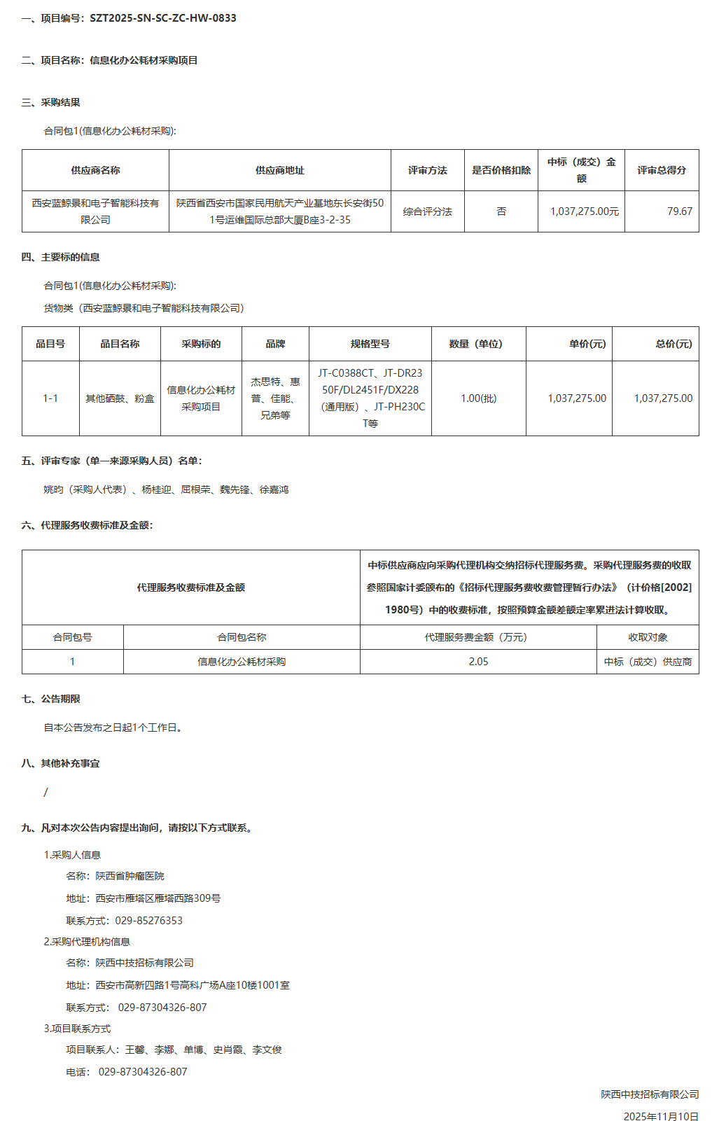 陕西省肿瘤医院信息化办公耗材采购项目中标(成交)结果公告