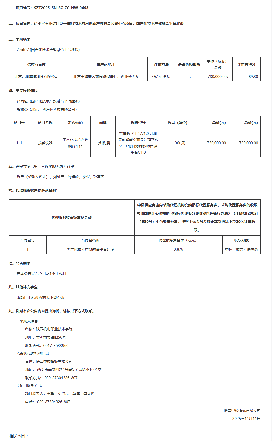 陕西机电职业技术学院高水平专业群建设—信息技术应用创新产教融合实践中心项目:国产化技术产教融合平台建设中标(成交)结果公告