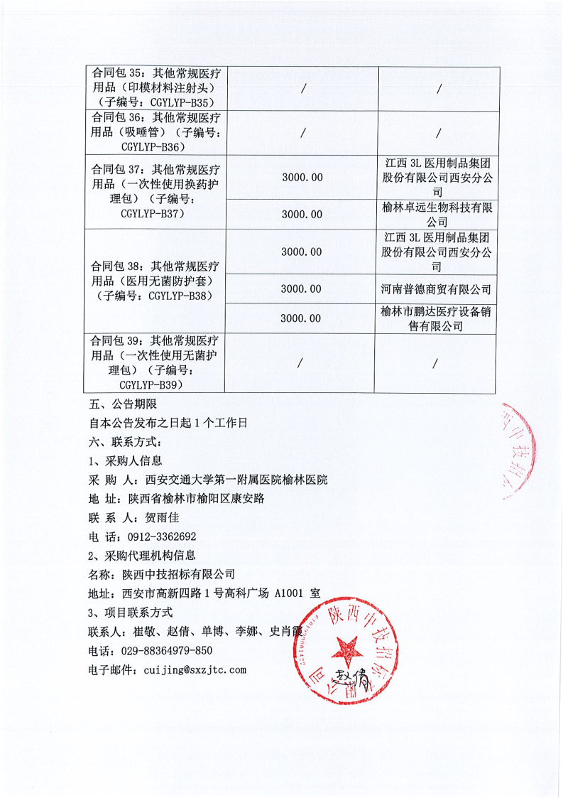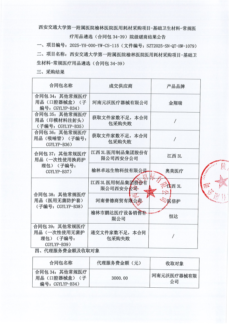 西安交通大学第一附属医院榆林医院医用耗材采购项目-基础卫生材料-常规医疗用品遴选(合同包34-39)院级磋商结果公告