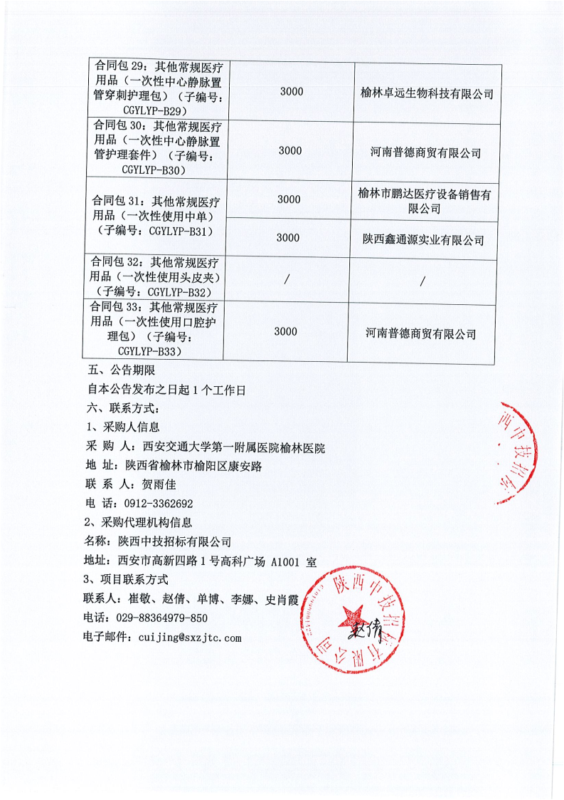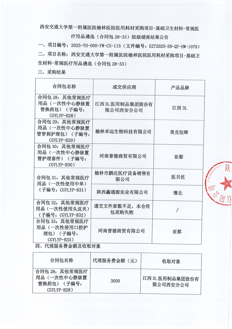 西安交通大学第一附属医院榆林医院医用耗材采购项目-基础卫生材料-常规医疗用品遴选(合同包28-33)院级磋商结果公告