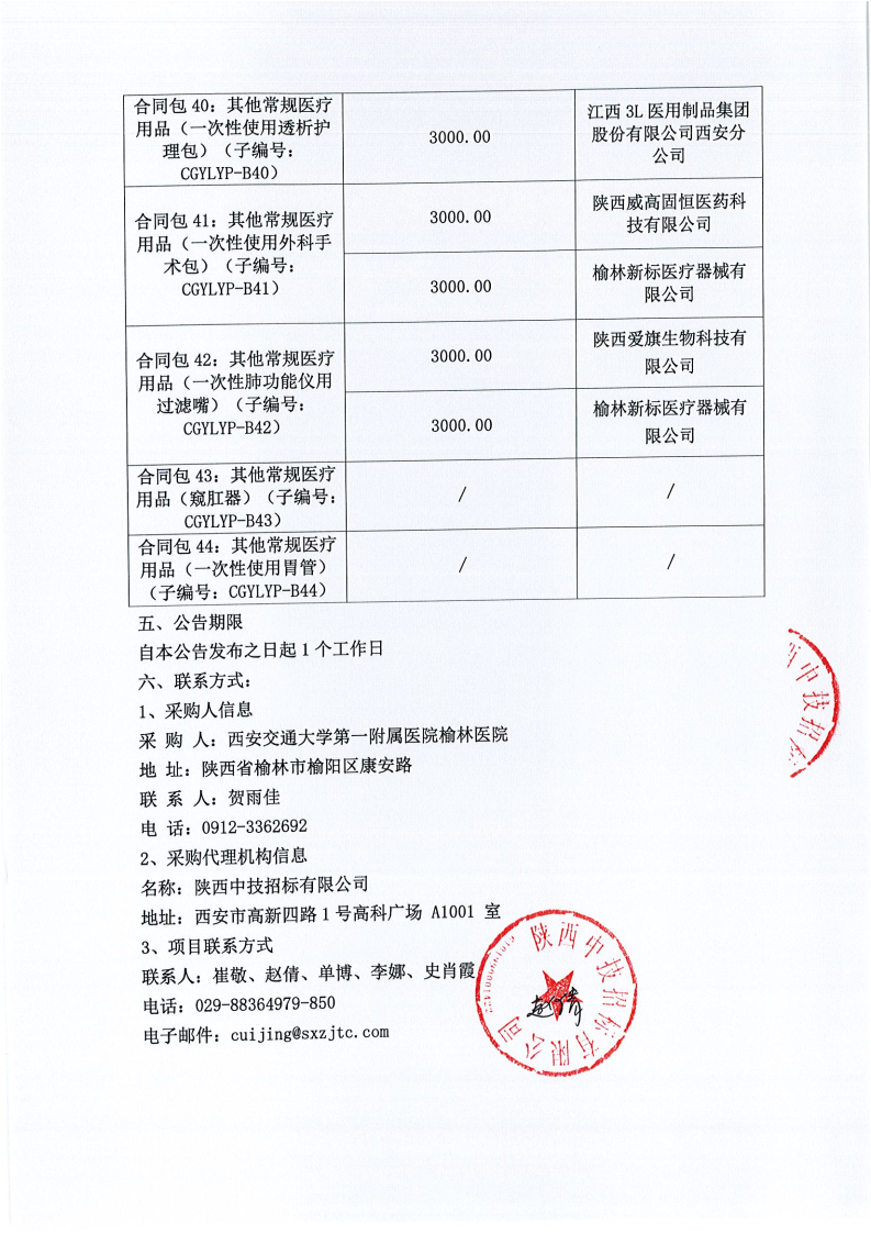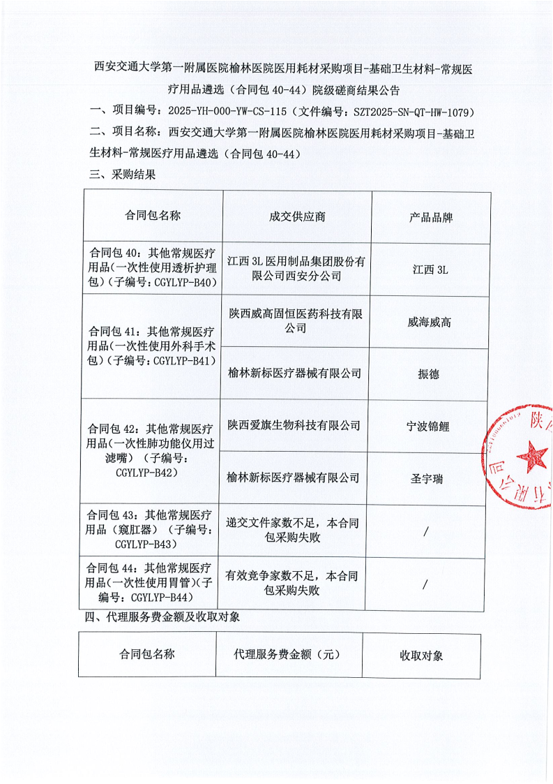 西安交通大学第一附属医院榆林医院医用耗材采购项目-基础卫生材料-常规医疗用品遴选(合同包40-44)院级磋商结果公告