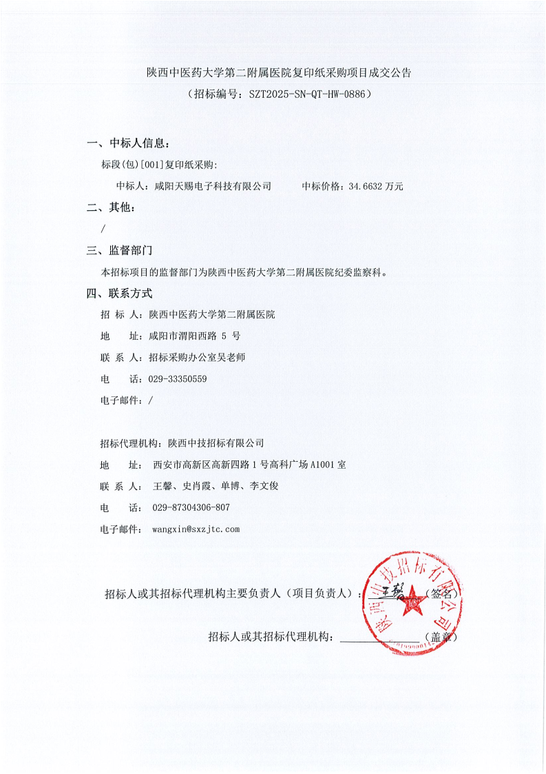 陕西中医药大学第二附属医院复印纸采购项目成交公告