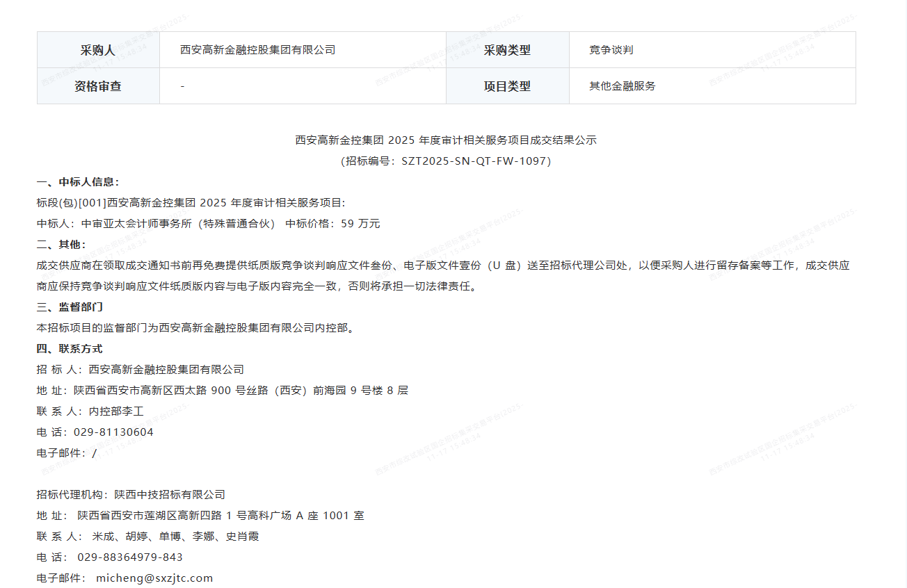 西安高新金控集团2025年度审计相关服务项目中标公告