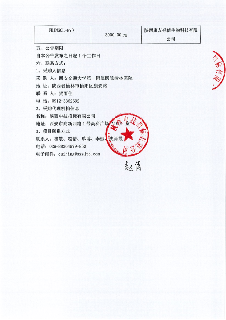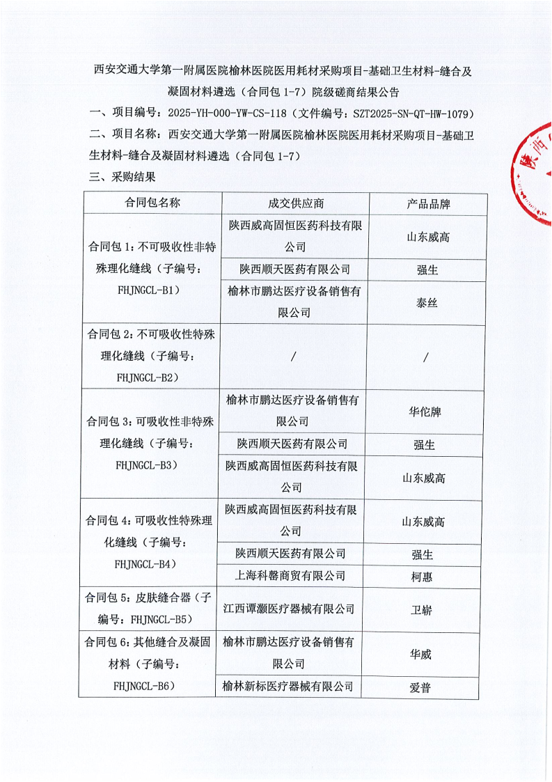 西安交通大学第一附属医院榆林医院医用耗材采购项目-基础卫生材料-缝合及凝固材料遴选(合同包1-7)院级磋商结果公告