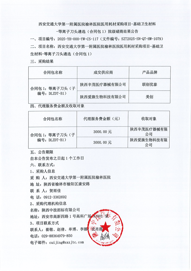 西安交通大学第一附属医院榆林医院医用耗材采购项目-基础卫生材料-等离子刀头遴选(合同包1)院级磋商结果公告