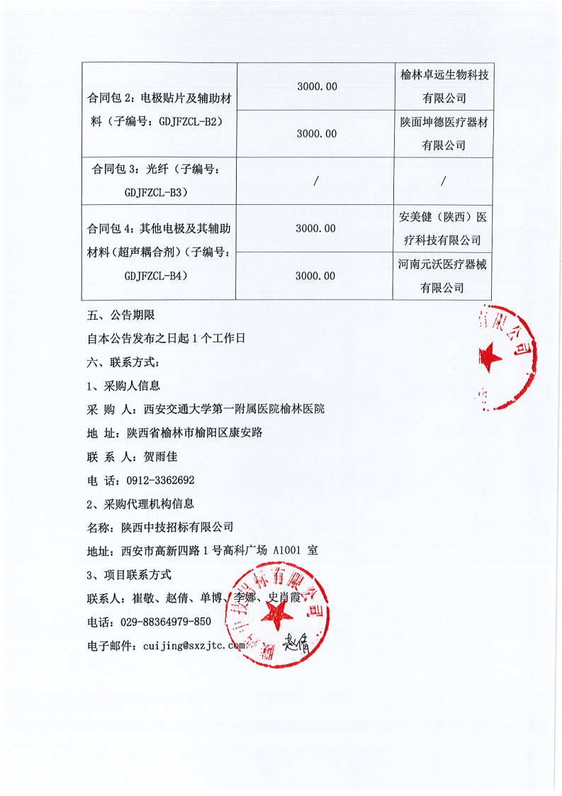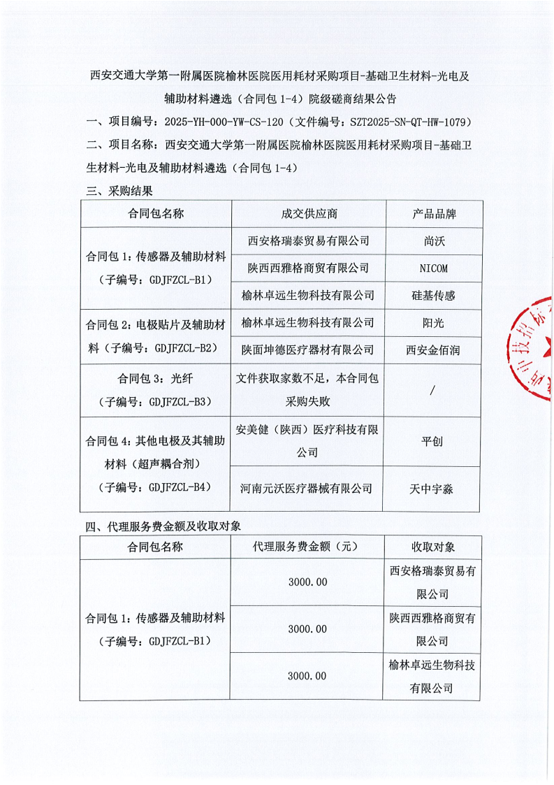 西安交通大学第一附属医院榆林医院医用耗材采购项目-基础卫生材料-光电及辅助材料遴选(合同包1-4)院级磋商结果公告
