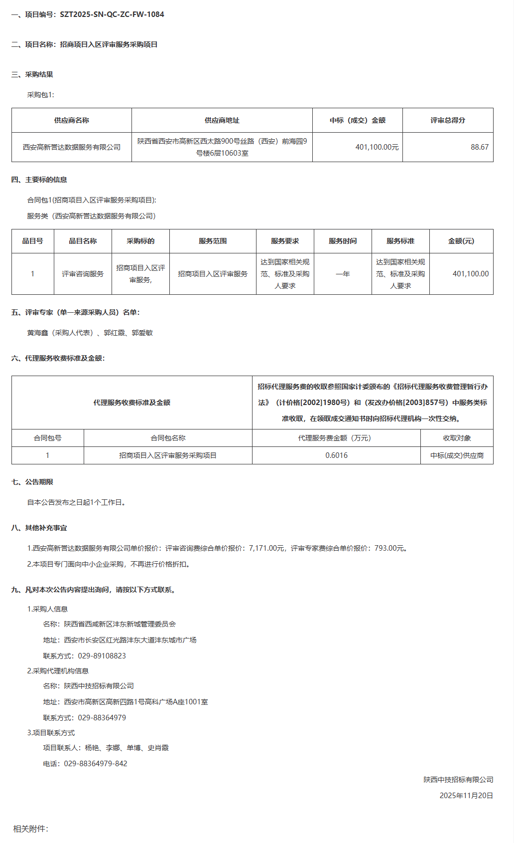 陕西省西咸新区沣东新城管理委员会招商项目入区评审服务采购项目中标(成交)结果公告