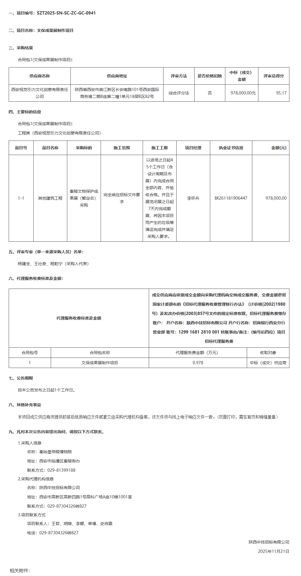 秦始皇帝陵博物院文保成果展制作项目中标(成交)结果公告
