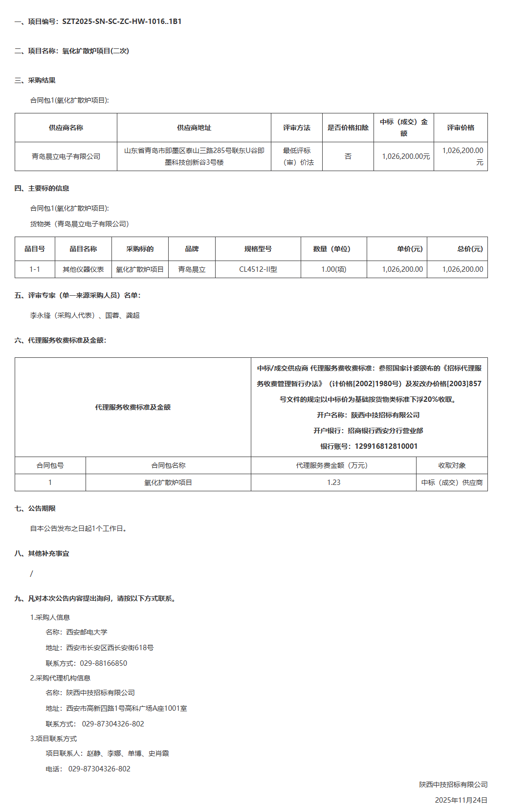 西安邮电大学氧化扩散炉项目(二次)中标(成交)结果公告