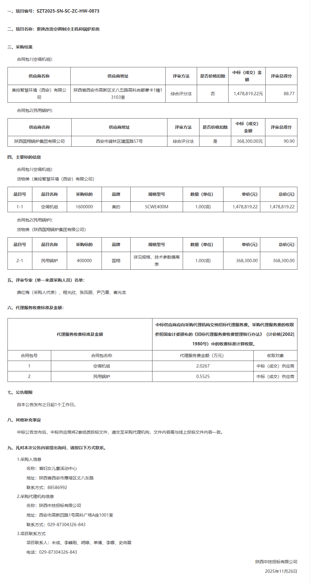 省妇女儿童活动中心更换改造空调制冷主机和锅炉系统中标(成交)结果公告