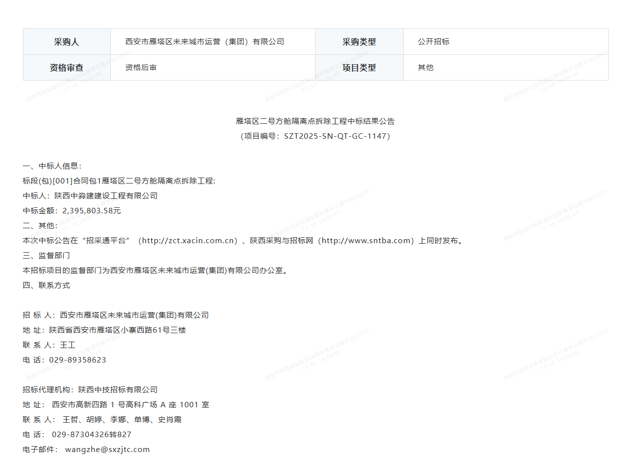 雁塔区二号方舱隔离点拆除工程中标结果公告