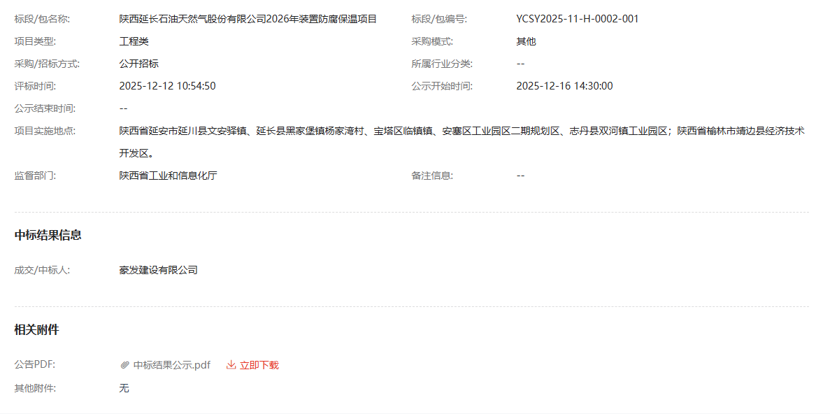 陕西延长石油天然气股份有限公司2026年装置防腐保温项目中标结果公示