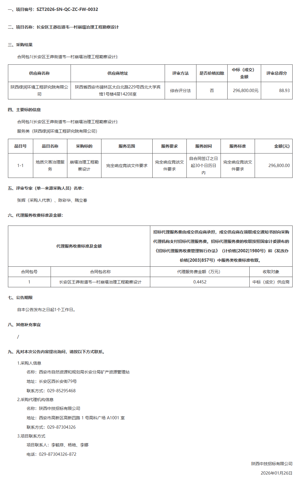 西安市自然资源和规划局长安分局矿产资源管理站长安区王莽街道韦一村崩塌治理工程勘察设计中标(成交)结果公告
