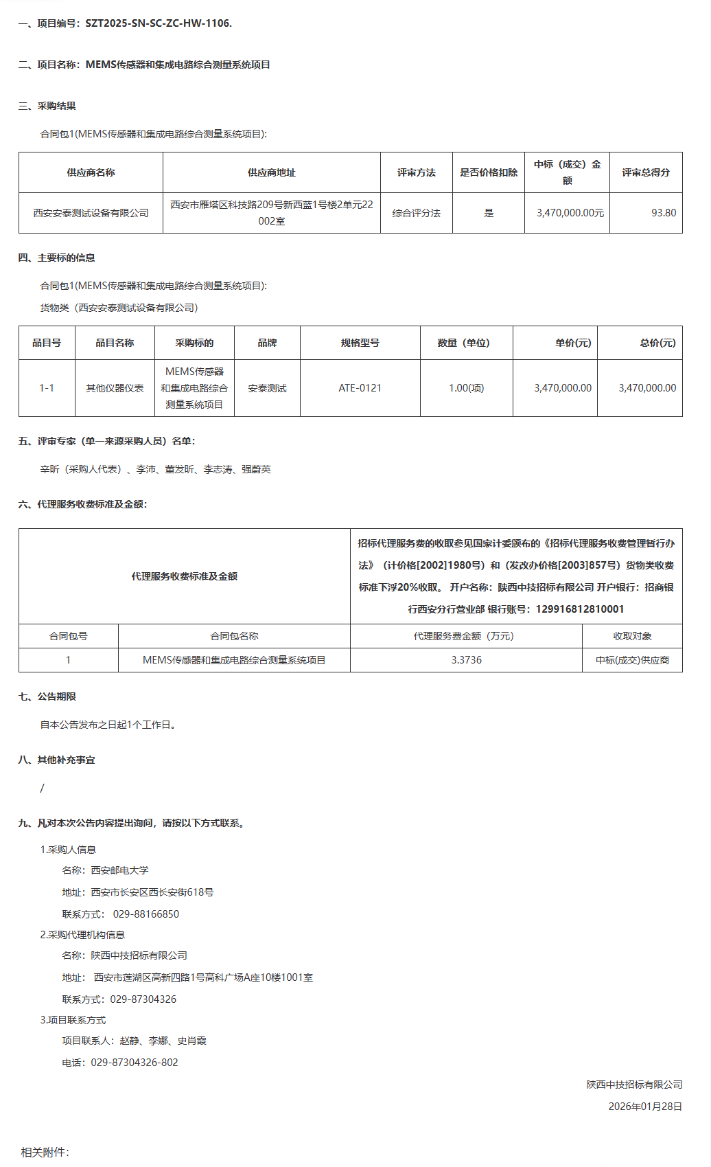 西安邮电大学MEMS传感器和集成电路综合测量系统项目中标(成交)结果公告