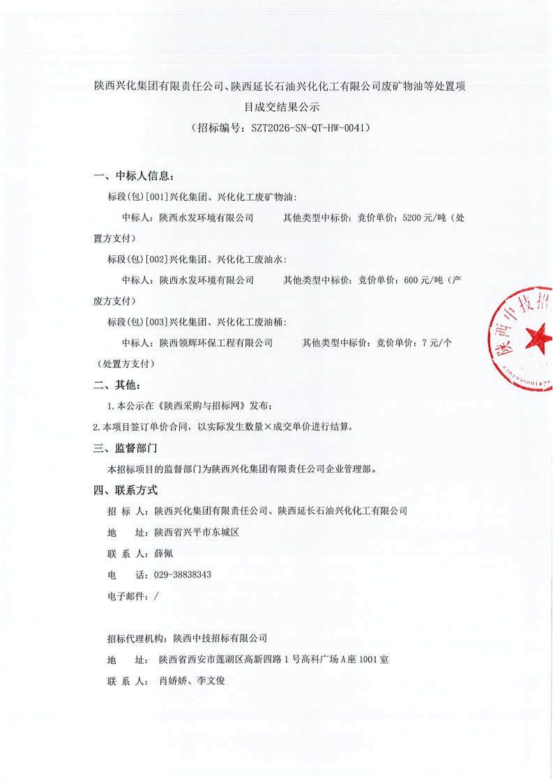 陕西兴化集团有限责任公司、陕西延长石油兴化化工有限公司废矿物油等处置项目成交结果公示