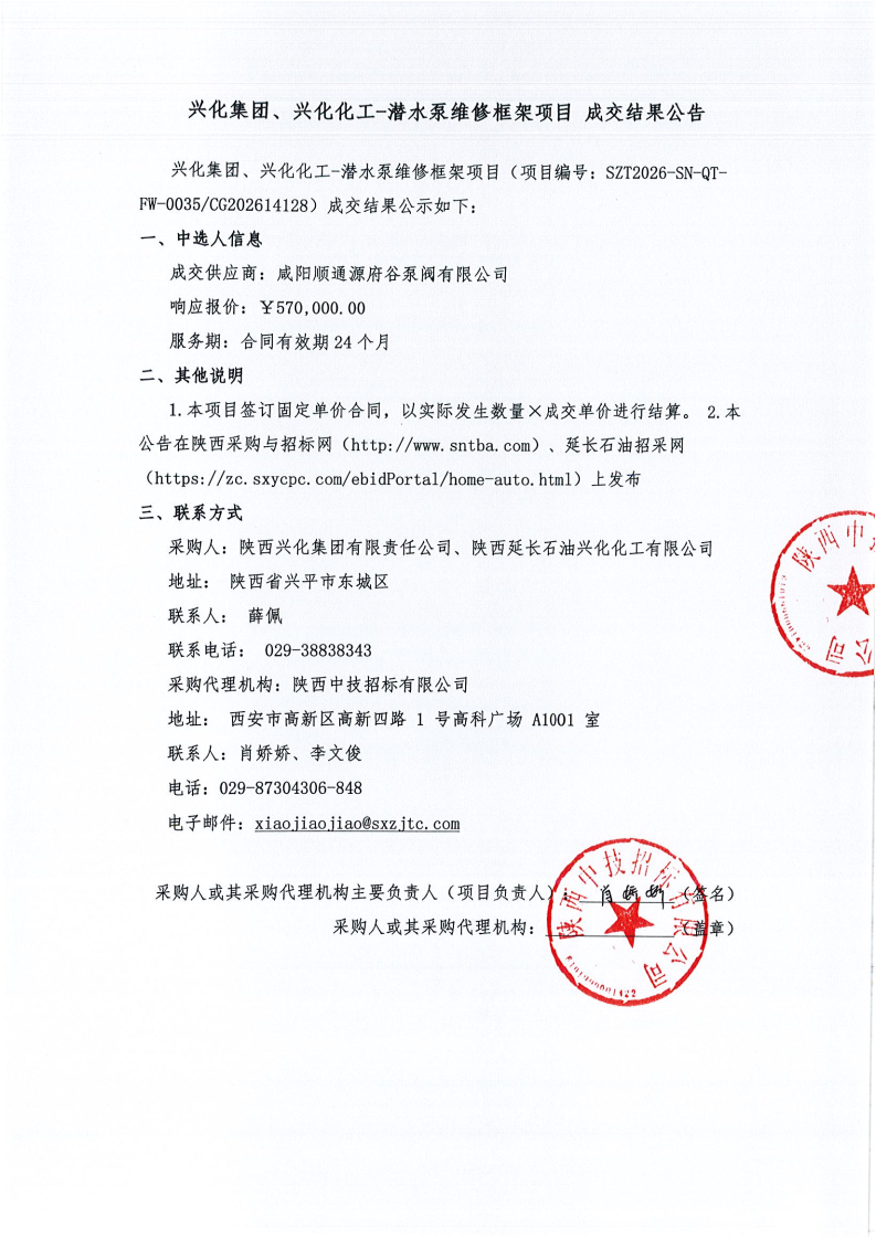 兴化集团、兴化化工-潜水泵维修框架项目 成交结果公告